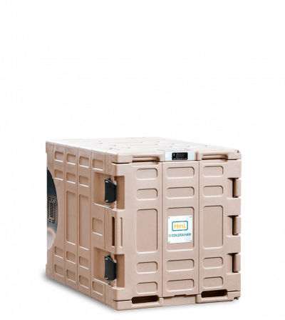 One-piece front opening container made of food grade polyethylene (PE) by rotational molding, 330 liter gross internal volume. Reinforced insulation made of expanded polyurethane (PU) with “K” coefficient of 0,27 W/m2K. Heating system with 12V PTC modules with 450W heating power (12V). Electronic thermostat with digital display, and temperature adjustment range from + 65°C a + 85°C.